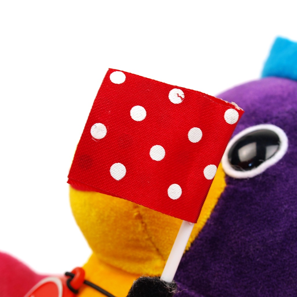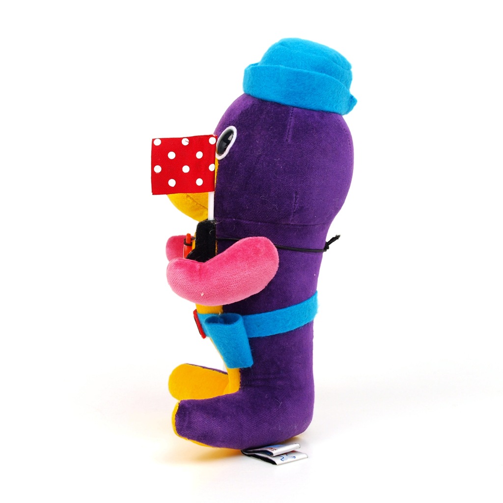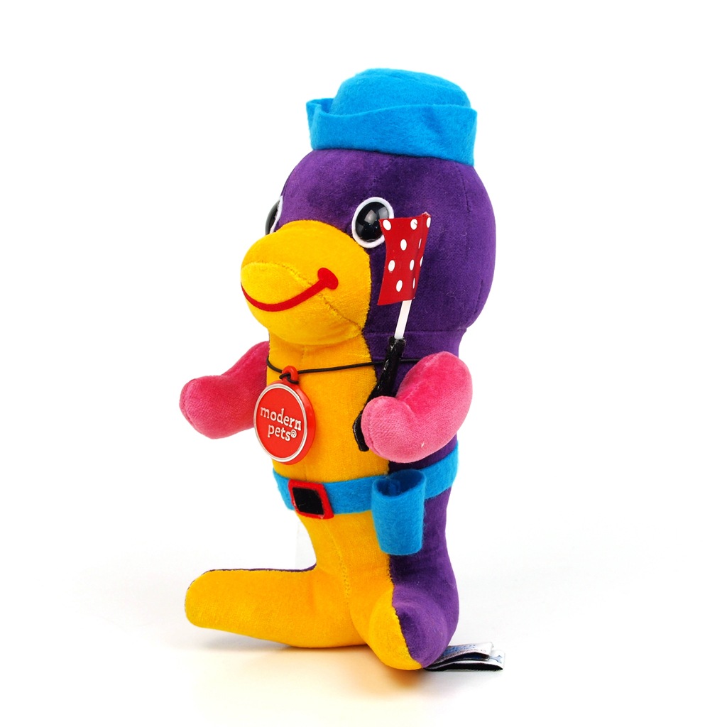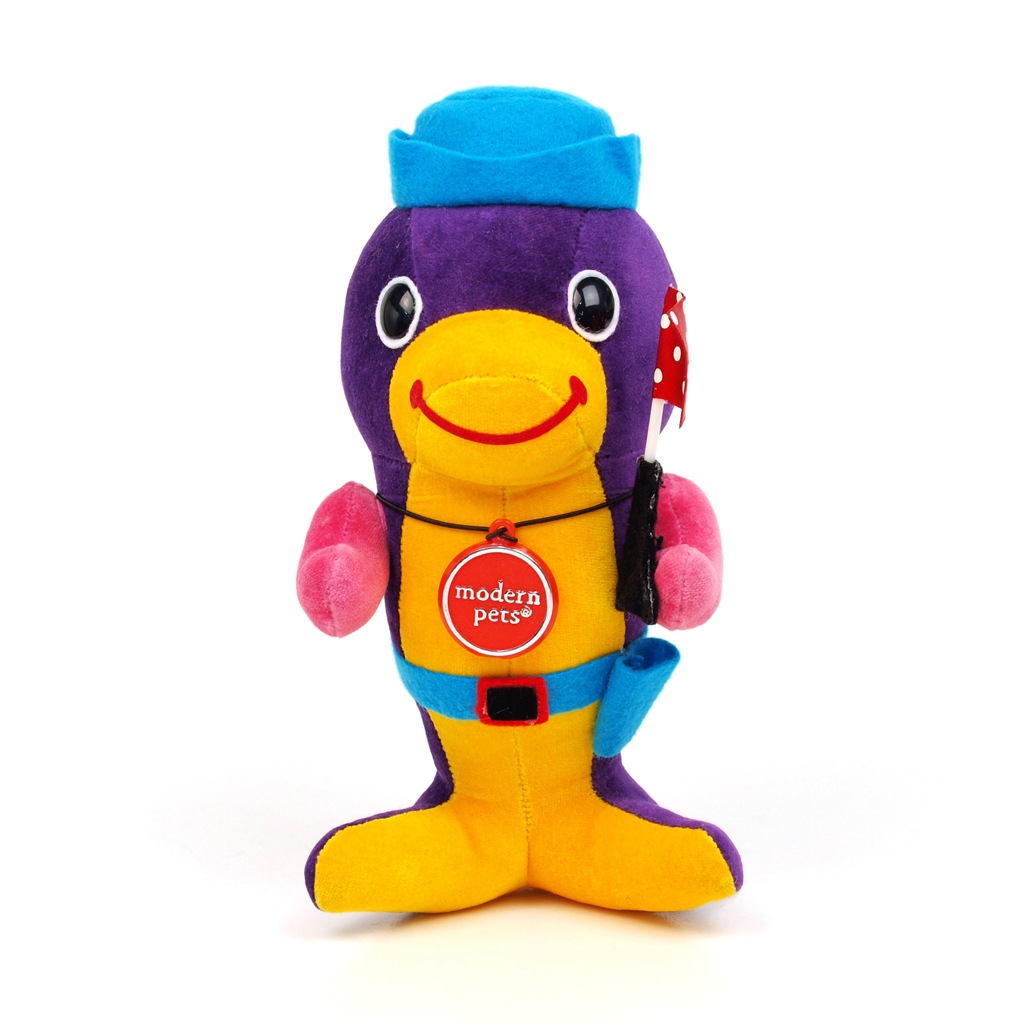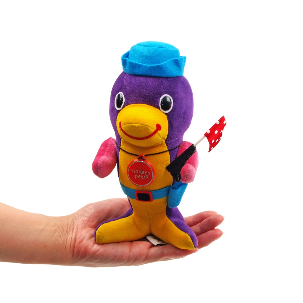 「モダンペッツ ビリードルフィン」シリーズは、遊園地のショーに登場するウェスタンのガンマンをイメージしたイルカのぬいぐるみシリーズです。ガンマンなので、腰にはフエルト製ガンベルトをつけ(フエルトの帽子とコーディネートしてます)、でも遊園地のショーに出ているガンマンなので、ガンの先には水玉の「なんちゃってフラッグ」がついています♪