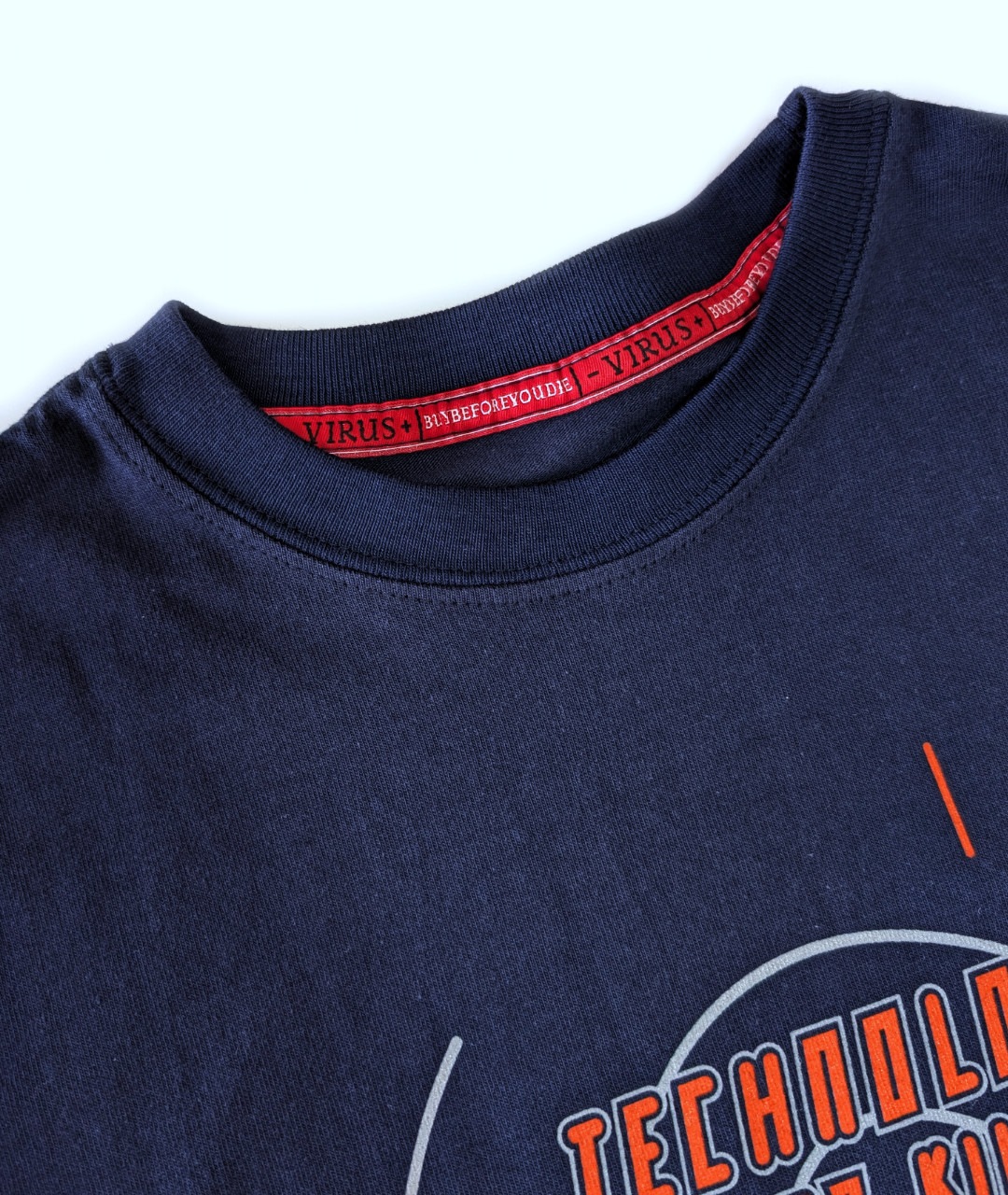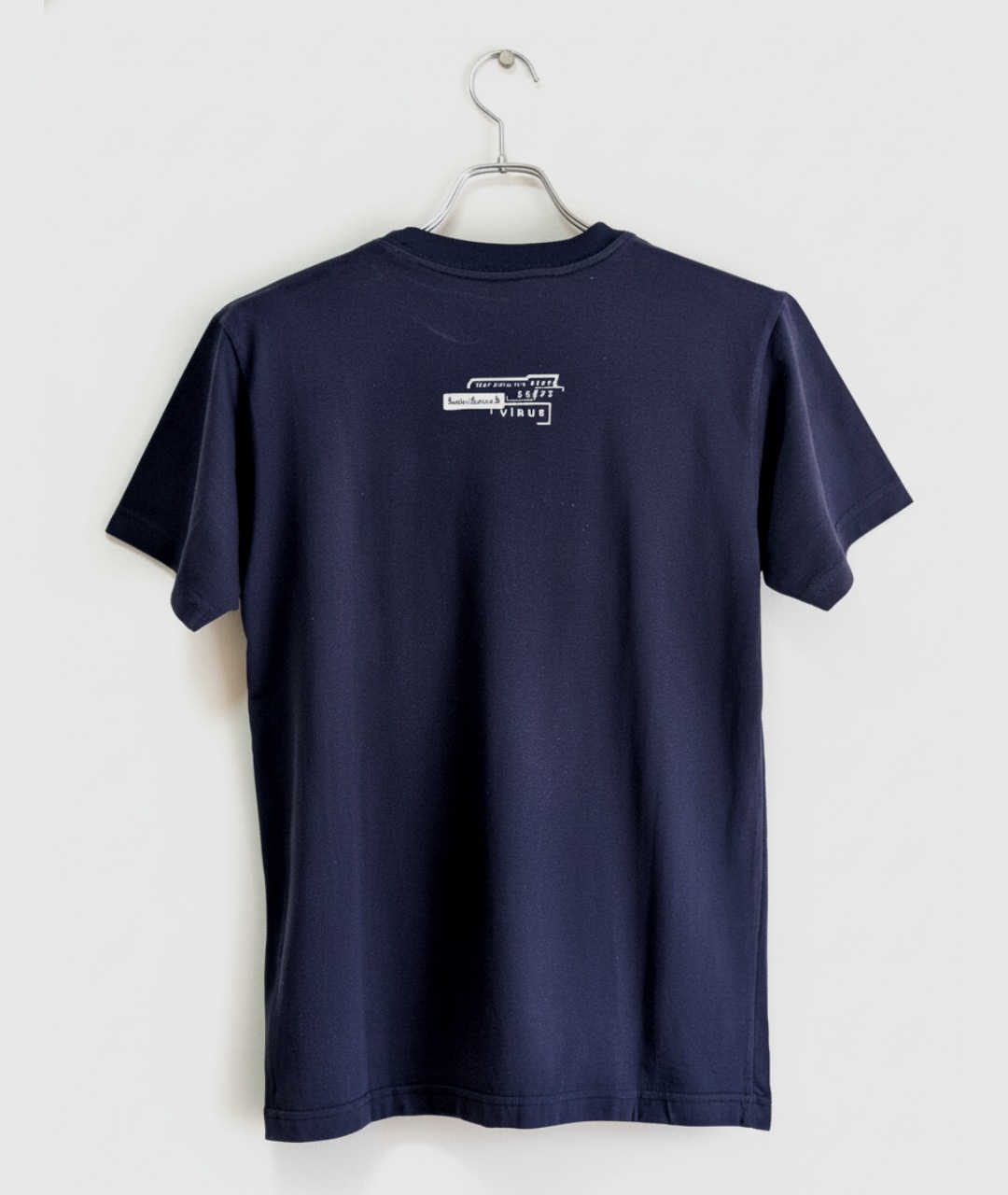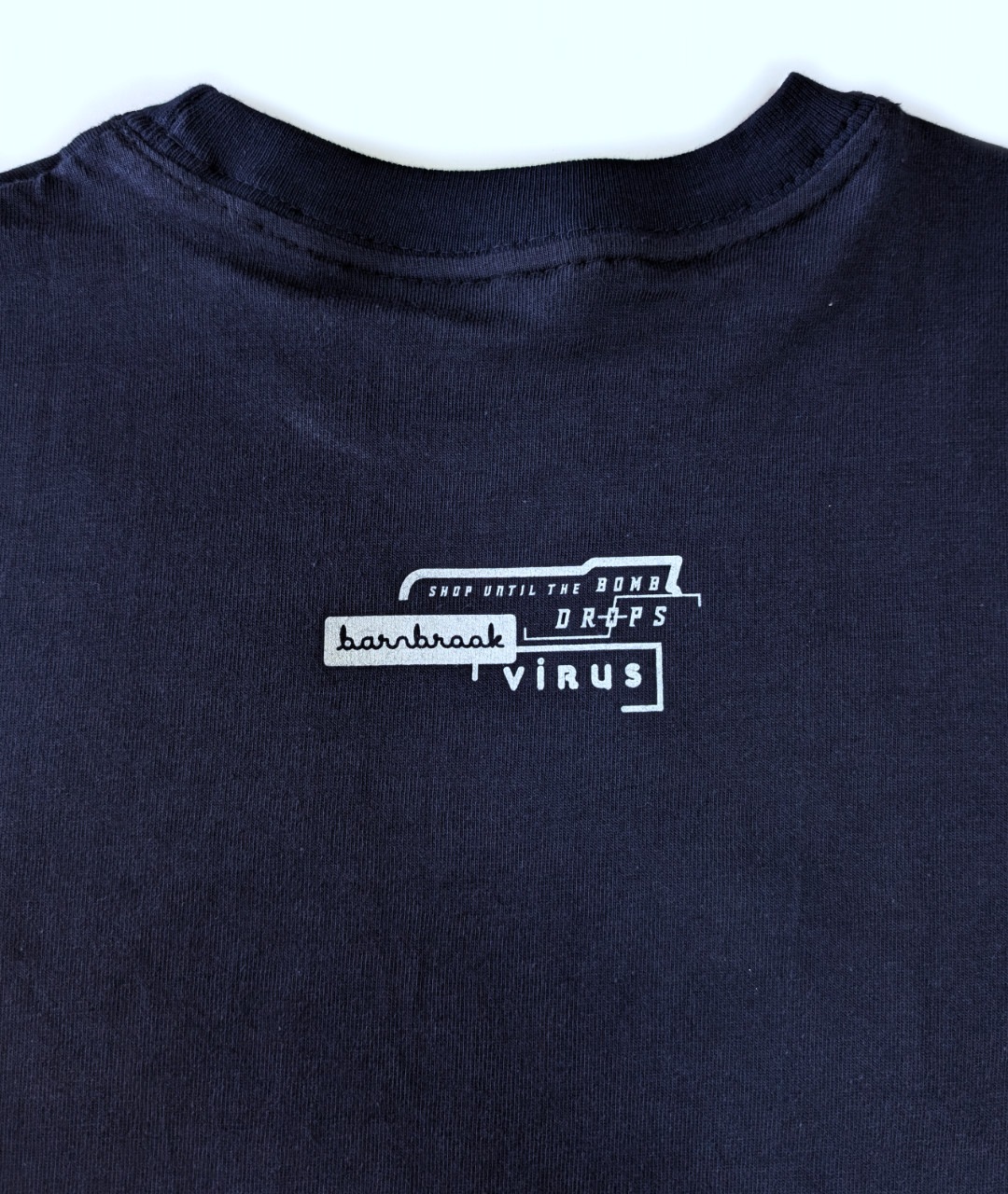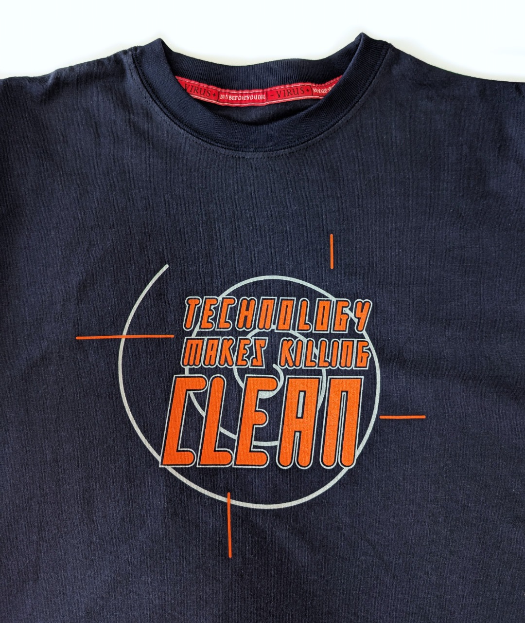 こちらは、そんなジョナサン・バーンブルックがデザインしたレア物Tシャツです。フォント作家とも呼ばれるバーンブルックオリジナルの「アポカリプソ・ピクトグラム・フォント」で書かれた胸元のプリントの文字「Technology Makes Killing Clean(技術が殺人を清潔にした)」は、技術発達によって人間が戦争で実際に手を汚すことなく殺人が行われるようになったという彼の強い訴えです。