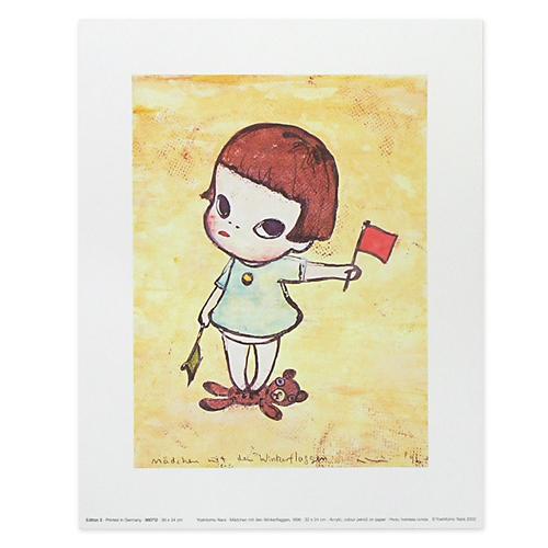 こちらの「手旗信号少女ポスター」は、愛らしいおかっぱ頭の子供が、高さが欲しかったのか、それとも先にクマちゃんが持っていた手旗を格闘の末にゲットした結果なのか・・・何はともあれ、何事も無かったかのごとくクマちゃんを踏みつけ、手旗信号を送っている姿が、自分の中にある過去や現在の童心を刺激してくれる奈良美智ポスターです。