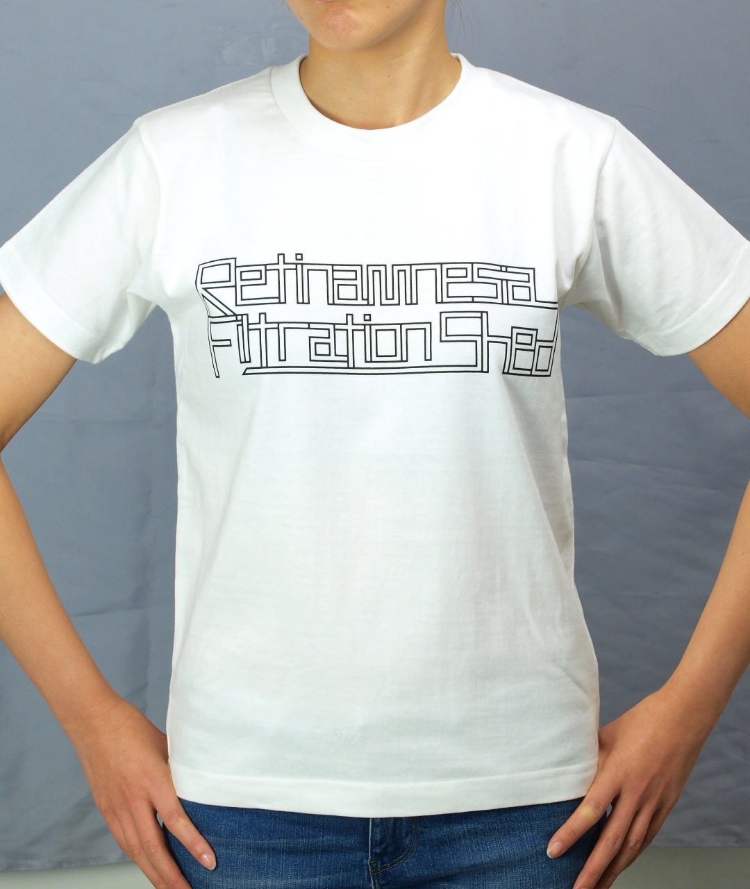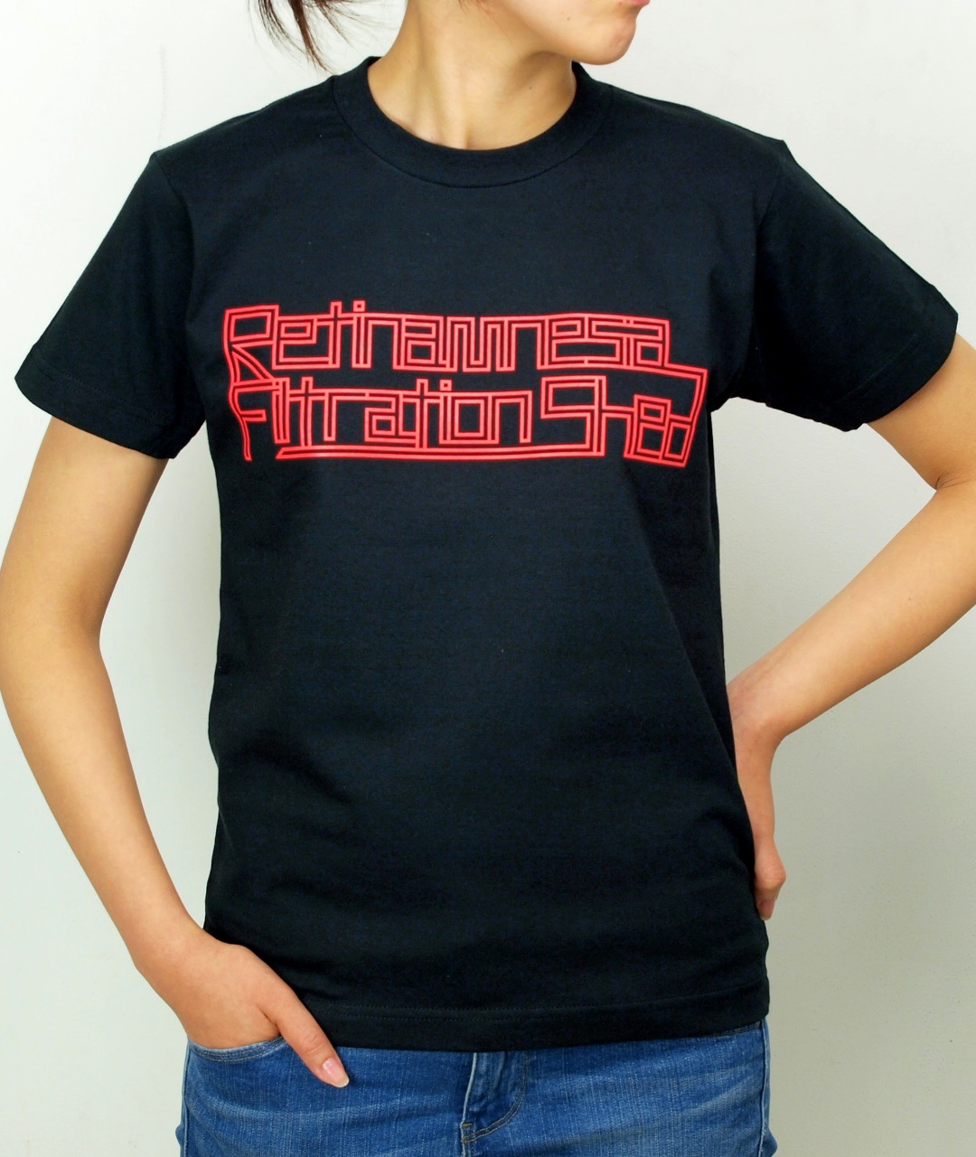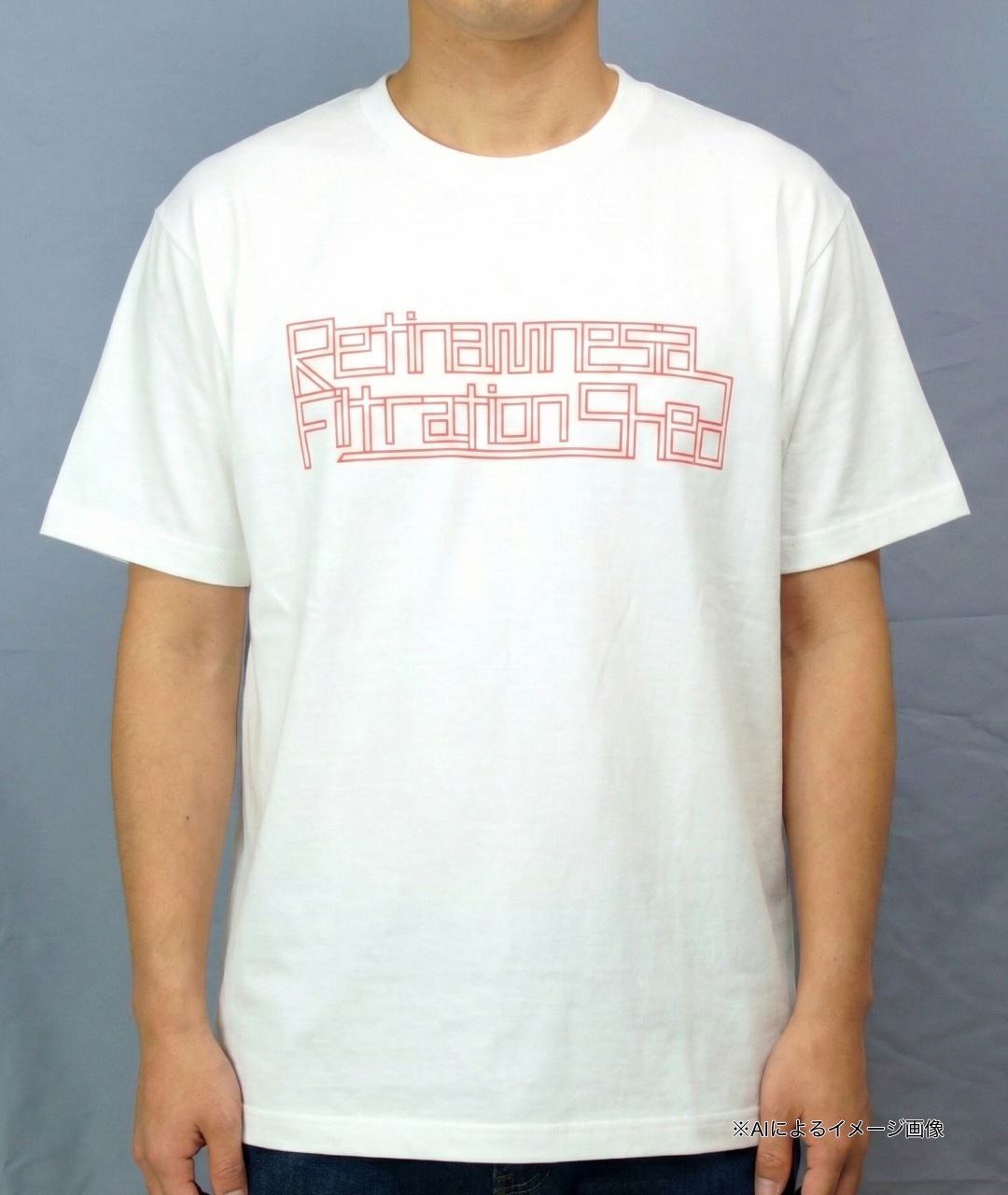 「網膜屋 Tシャツ」は、「ヨコハマトリエンナーレ2014」に出品された大竹伸朗の作品『網膜屋/記憶濾過小屋』をモチーフに、大竹伸朗がデザインしたTシャツシリーズです。ネオン管を思わせる細長いフォントで、表側には「Retinamnesia Filtration Shed」の文字が、裏側には「網膜屋」の文字がプリントされています。
