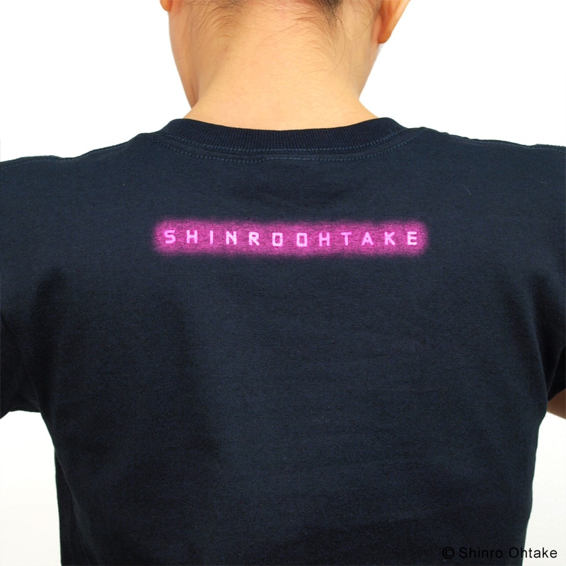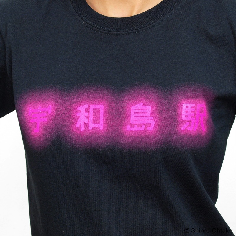 黒地のTシャツボディのフロントの文字は、夜になると宇和島駅駅舎の屋根の上で輝いていた、ネオン管で作られた「宇和島駅」の文字と同じく、ネオンカラーでプリントされています(バックプリントは「SHINRO OHTAKE」)。プリントカラーはオレンジとピンクの2タイプがあり、ネオンカラーらしさの出し方がそれぞれ少し違うプリント具合になっています。