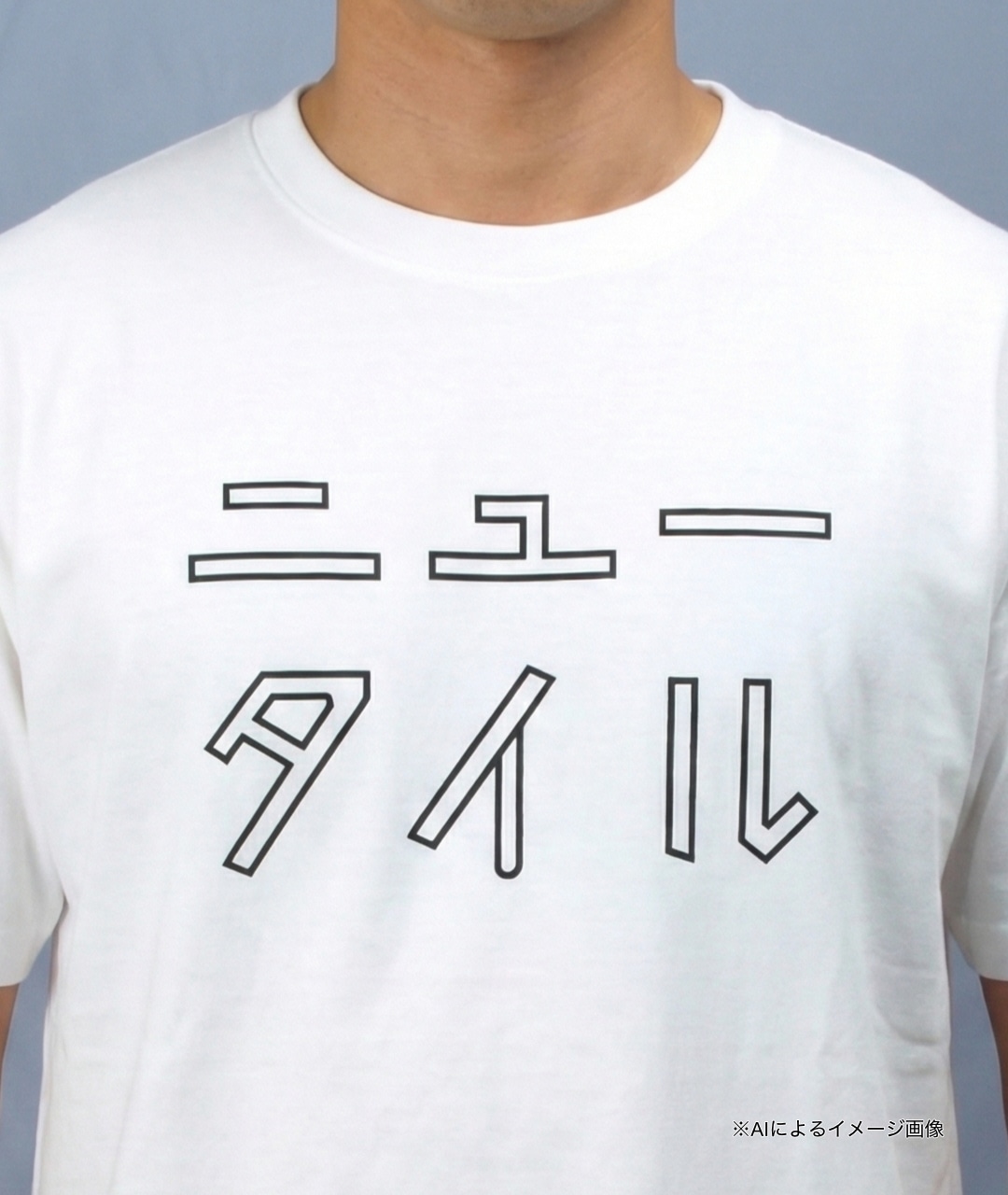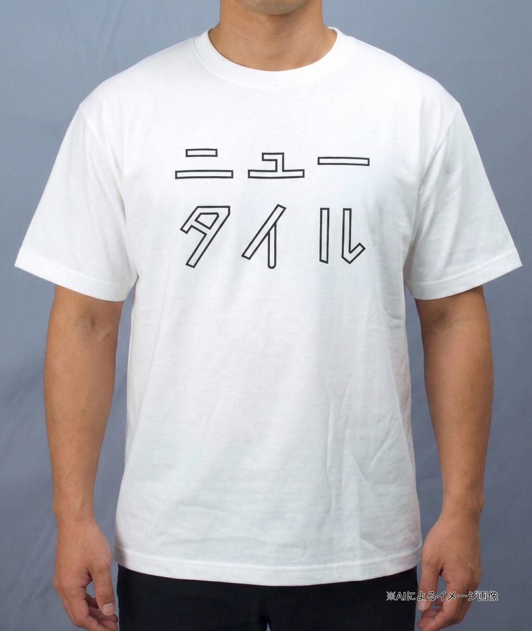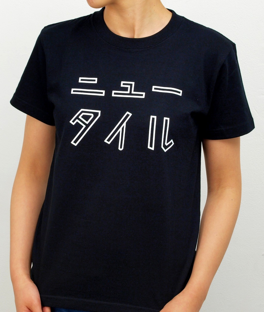 こちらは、愛知県常滑市にあるINAXライブミュージアムで開催された大竹伸朗展覧会『焼憶(やきおく)展(2013年2月~6月)』の公式グッズ「ニュータイル Tシャツ」です。Tシャツのフロントには「ニュータイル」の文字が、バックには展覧会の開催地である「常滑」の文字がそれぞれプリントされています。「ニュータイル」という文字は、本展覧会で転写による焼き付けのタイルを用いた作品を発表したことに由来していると思われます(展覧会タイトルは「記憶を焼き付ける」という意味だそう)。