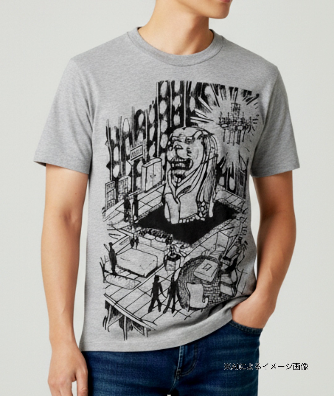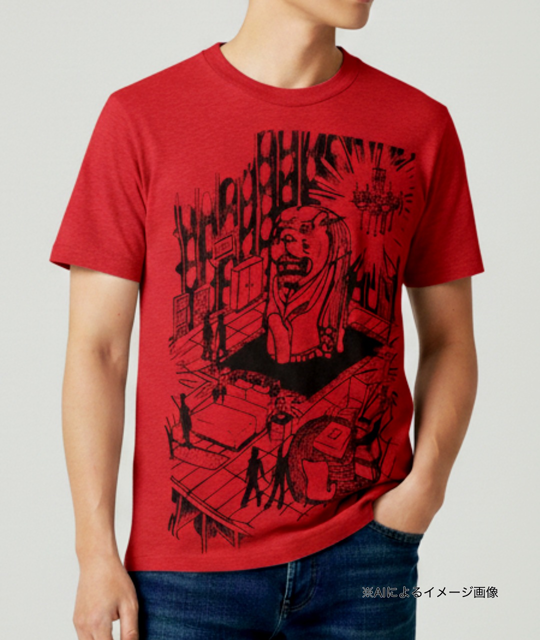 Tシャツは、どんな服装にも合わせやすいベーシックな白とグレーの2色に加えて、抑え目の色味がおしゃれな赤の3色展開。1枚で主役級の存在感を放つラムフロムオリジナルの西野達グッズです。