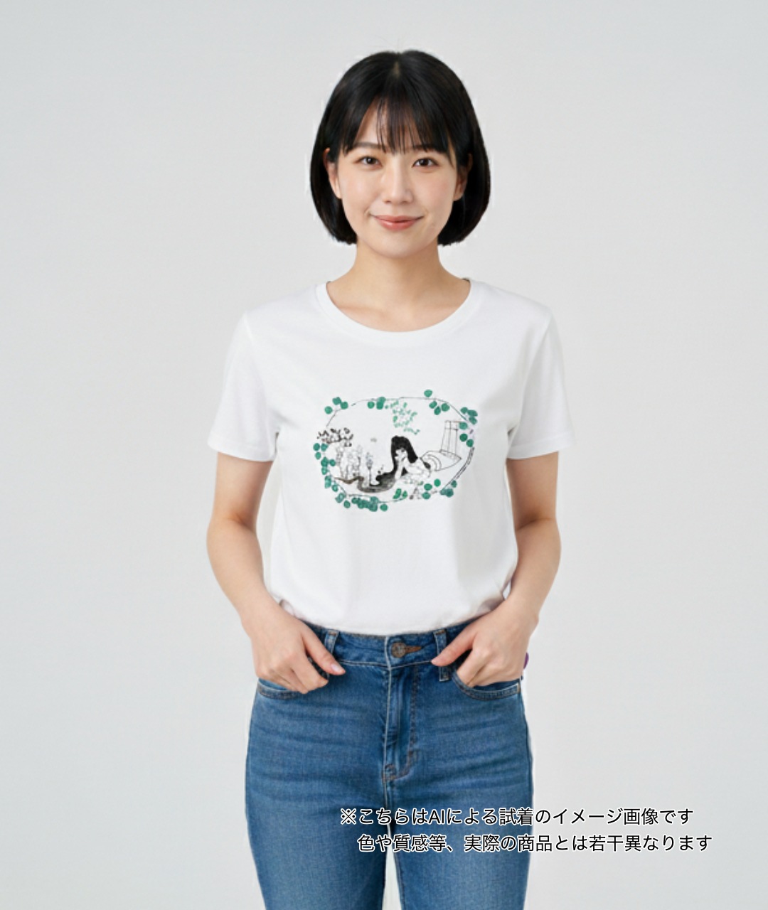 現代アーティストの山口藍が描く作品シリーズ『とうげのお茶や』をモチーフに製作された山口藍Tシャツシリーズより、「kato」と名づけられたこちらのTシャツは、うつぶせに横たわりほおづえをつく遊女「kato」のものうげな表情が印象的なアートTシャツです。