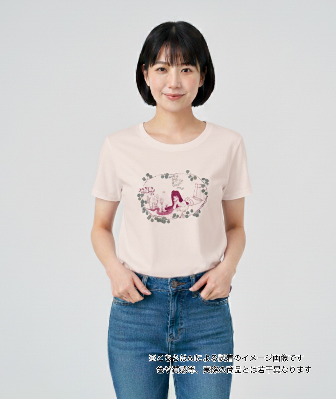 ※こちらのTシャツは、襟ぐりがやや広めで、袖がフレンチスリーブタイプの女性用ボディのTシャツです。また生地はやや薄めの生地となっています