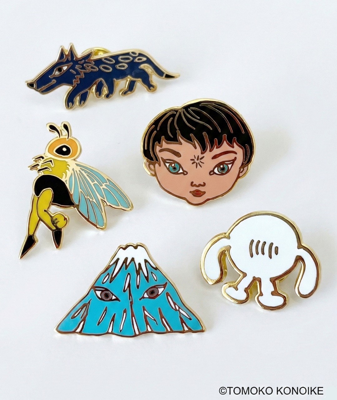羽の色が美しい人の足を持つ「ハチ」に、六本足でハンサム顔の「オオカミ」、エメラルドグリーンの目が印象的な「少女顔」、山の神様のような「隠れマウンテン」、そして、顔のない不思議な生き物「ミミオ(鴻池氏曰く、本当は顔を書きたかったんだけれども、結局最後まで書けなくて諦めのだとか)」など、全5種類のピンズシリーズとなっております。どれもモチーフの細かいところまで忠実に再現し、小ぶりながらもゴールドの土台が高級感を高めた仕上がりとなっている、ラムフロム自慢のアートグッズです。是非コンプリートしてください♪