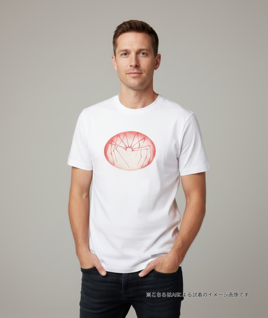 20世紀から21世紀を駆け抜けたアート界のグランドマザー、ルイーズ・ブルジョアのTシャツは、ホワイトボディに赤い色で、「人間」と「蜘蛛」をあわせて描かれた作品がプリントされた強烈なインパクトのTシャツですが、そのプリントの絵には、彼女の力強さや繊細さといった魅力も見てとれます。