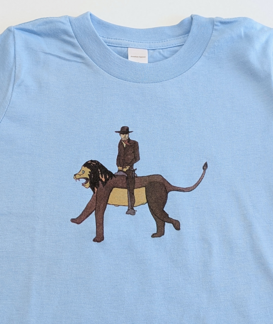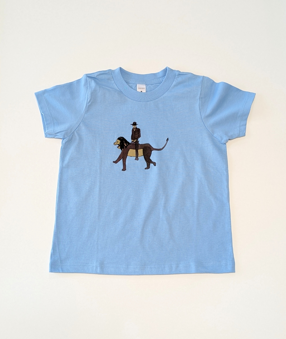 ロサンゼルス現代美術館(MOCA/The Museum of Contemporary Art, Los Angeles)のミュージアム・グッズとして販売されている、マルセル・ザマ(MARCEL DZAMA)の子供サイズTシャツは、百獣の王であるライオンと、その上にまたがったカーボーイ姿の男性の姿が描かれているドローイングをモチーフにデザインされたアートなTシャツです。