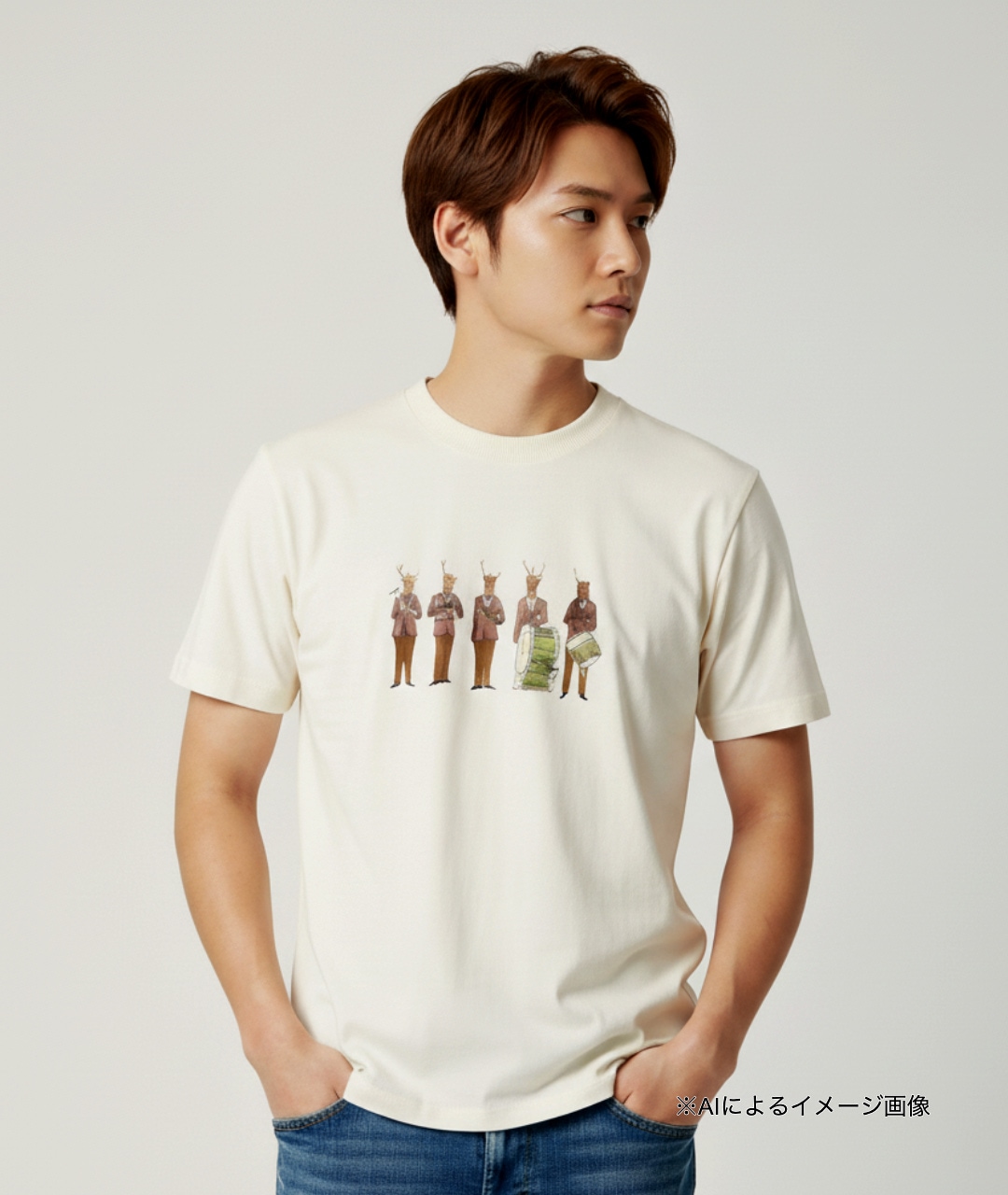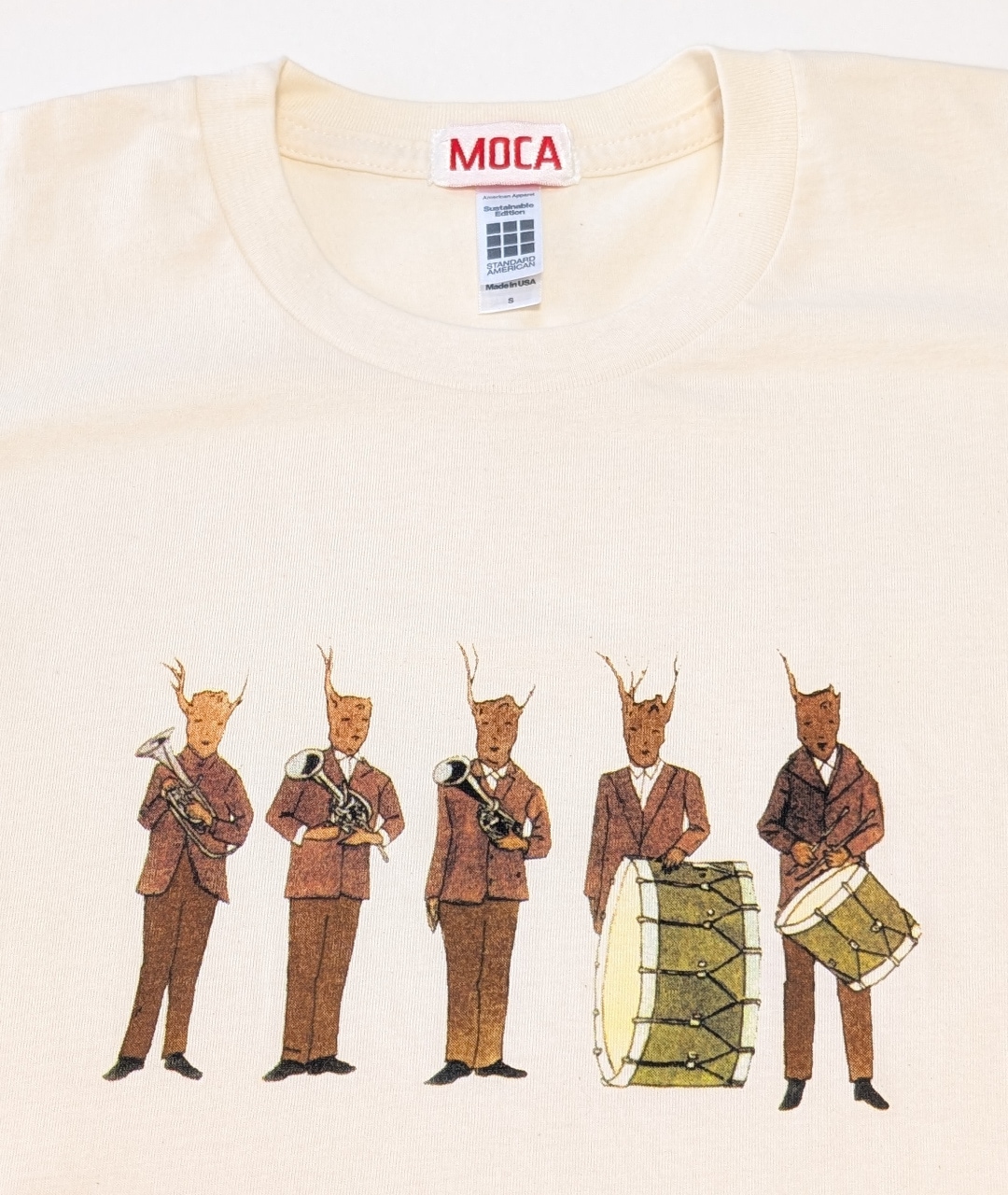 ロサンゼルス現代美術館(MOCA/The Museum of Contemporary Art, Los Angeles)のミュージアム・グッズとして販売されている、マルセル・ザマ(MARCEL DZAMA)のTシャツは、マルセル・ザマの作品にも度々登場する「ツリーマン(TREE MAN)」をモチーフにデザインされたアートTシャツです。オシャレなブラウンカラーのスーツに身を包んだツリーマンが5人(もしかして5木?)、それぞれ楽器を手にして整列しています。