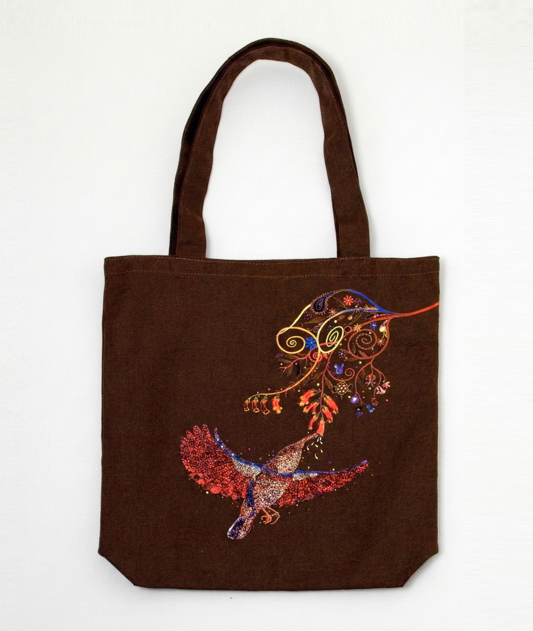 「飛ぶ宝石」と呼ばれるハミングバード(ハチドリ)がモチーフのこの「HUMMINGBIRD トートバッグ」は、フレッド・トマセリの独特の手法により、羽を広げるハチドリがまるで散りばめられた宝石で描かれているように見える美しいプリントのバッグです。また、深めに作られ内側にはジップのポケットが付いており、小物がバッグ内に散乱する心配もありません。シックな大人のイメージのバッグをお探しの方におススメです☆