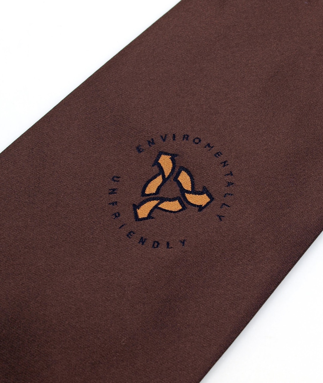 現代アーティストのスティーブン・ピピン(Steven Pippin)は、1960年生まれのイギリス人で、バスタブや冷蔵庫で作ったピンホールカメラなどで撮影した写真作品で知られるアーティストです。ネクタイのデザインになっている、環境への優しさを示しているエコマークをひっくり返し、それを囲うように「ENVIROMENTALLY UNFRIENDLY(直訳すると、環境に優しくないです)」という文字には、シニカルでとても深い意味がありそうです。