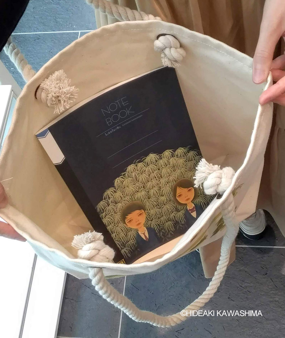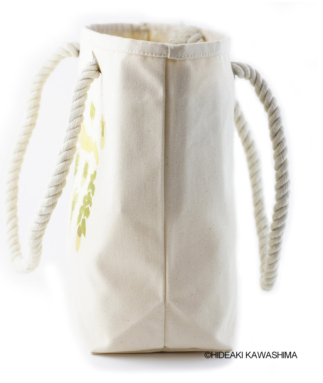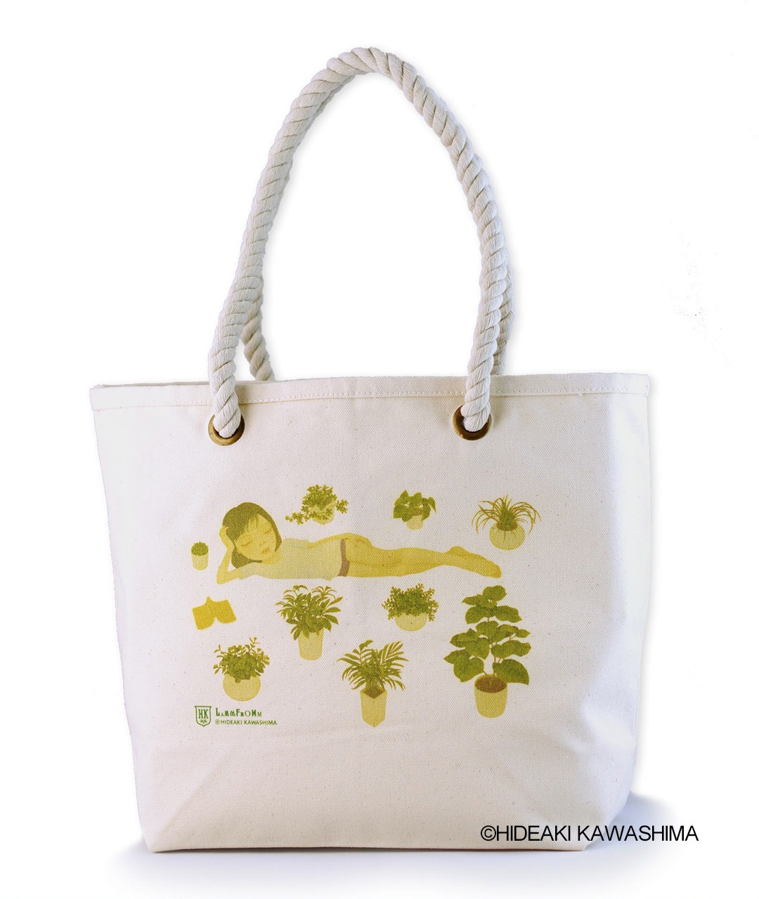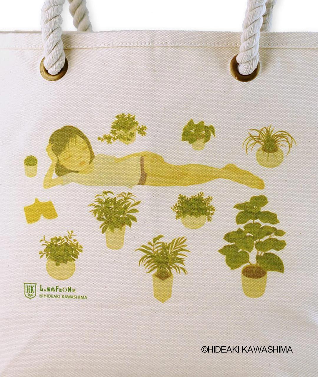 この度ラムフロムでは、川島秀明オリジナルグッズを企画製作しました。こちらのアイテムは、『Nap』をモチーフにしたロープハンドルバッグです。お昼寝中の女の子と観葉植物が並んでいる絵がプリントされている、ざっくりしたコットンキャンバスのバッグは、使い勝手の良いカジュアルなタイプのバッグです。