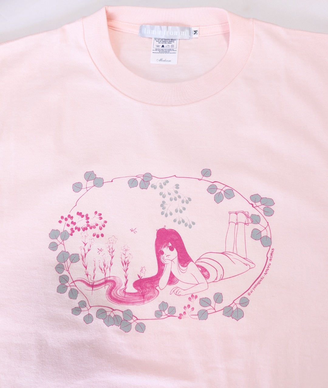 現代アーティストの山口藍が描く作品シリーズ『とうげのお茶や』をモチーフに製作された山口藍Tシャツシリーズより、「kato」と名づけられたこちらのTシャツは、うつぶせに横たわりほおづえをつく遊女「kato」のものうげな表情が印象的なアートTシャツです。